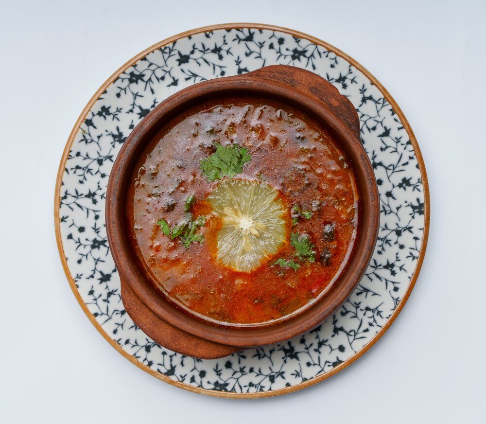 Говядина, соленые огурцы, оливки, лук, сметана, лимон.